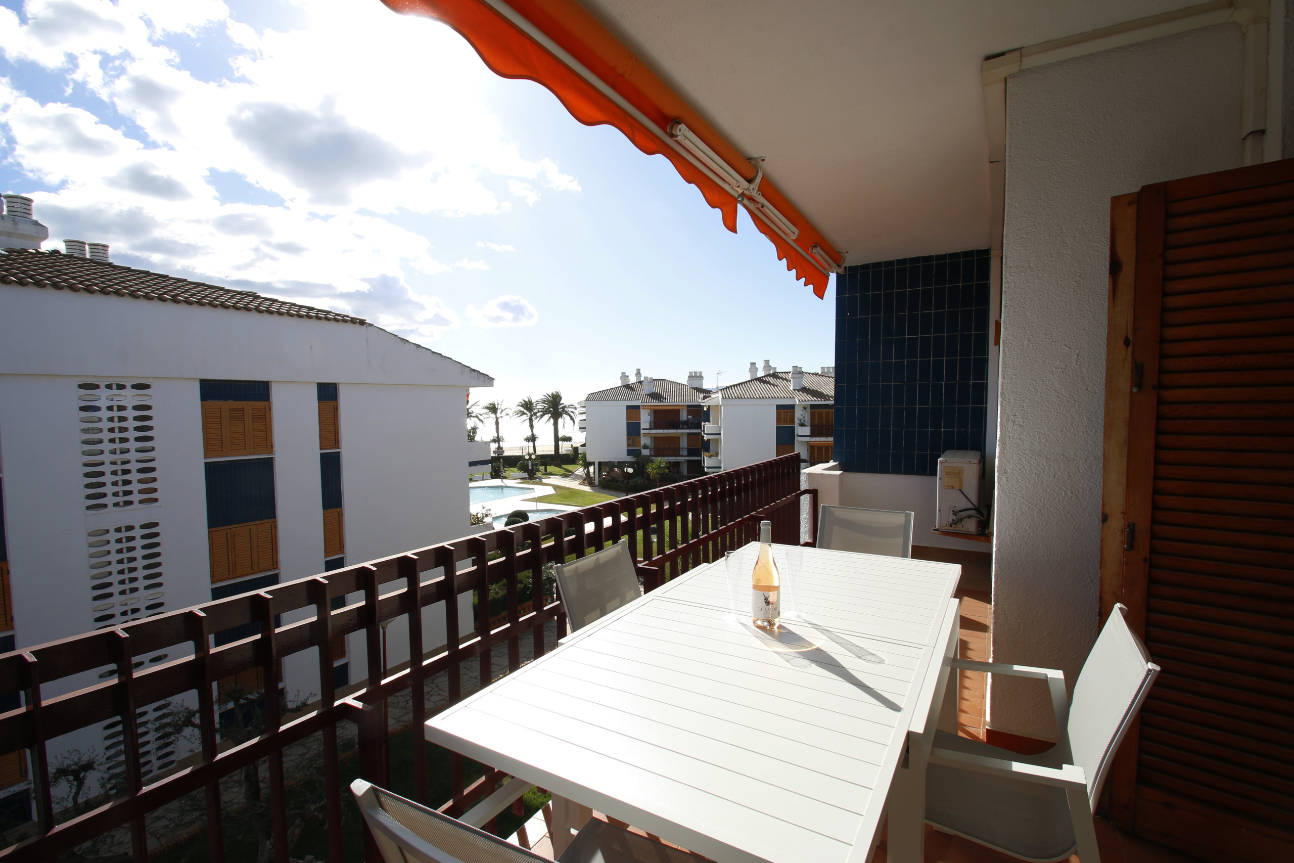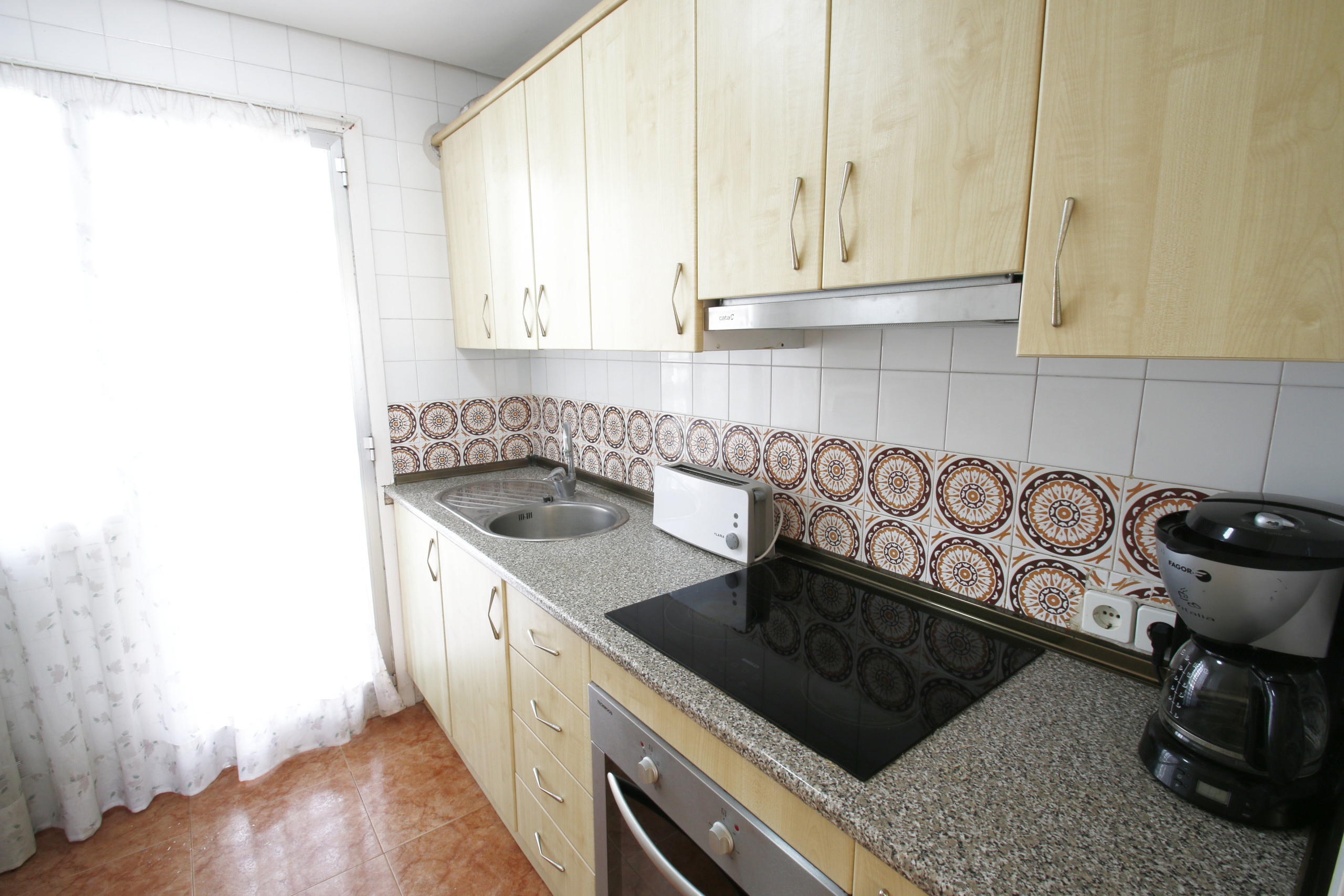 La vivienda cuenta con 2 dormitorios, salón-comedor con aire acondicionado, baño completo con bañera y una terraza con agradables vistas al mar, ideal para desayunar al aire libre o disfrutar de cenas al atardecer con la brisa mediterránea. La cocina independiente está equipada con vitrocerámica, horno, microondas, tostadora y cafetera, pensada para una estancia práctica y funcional.
