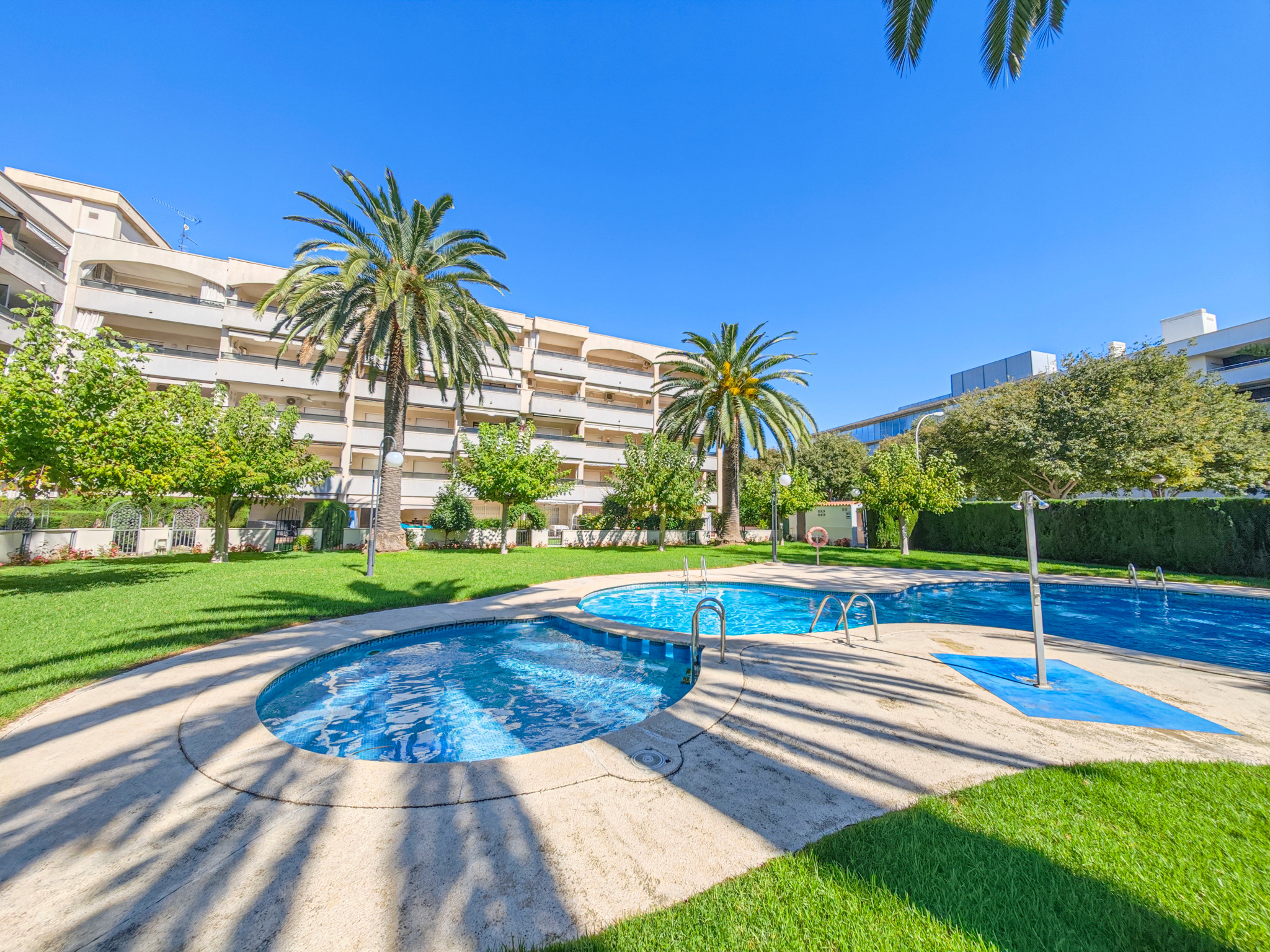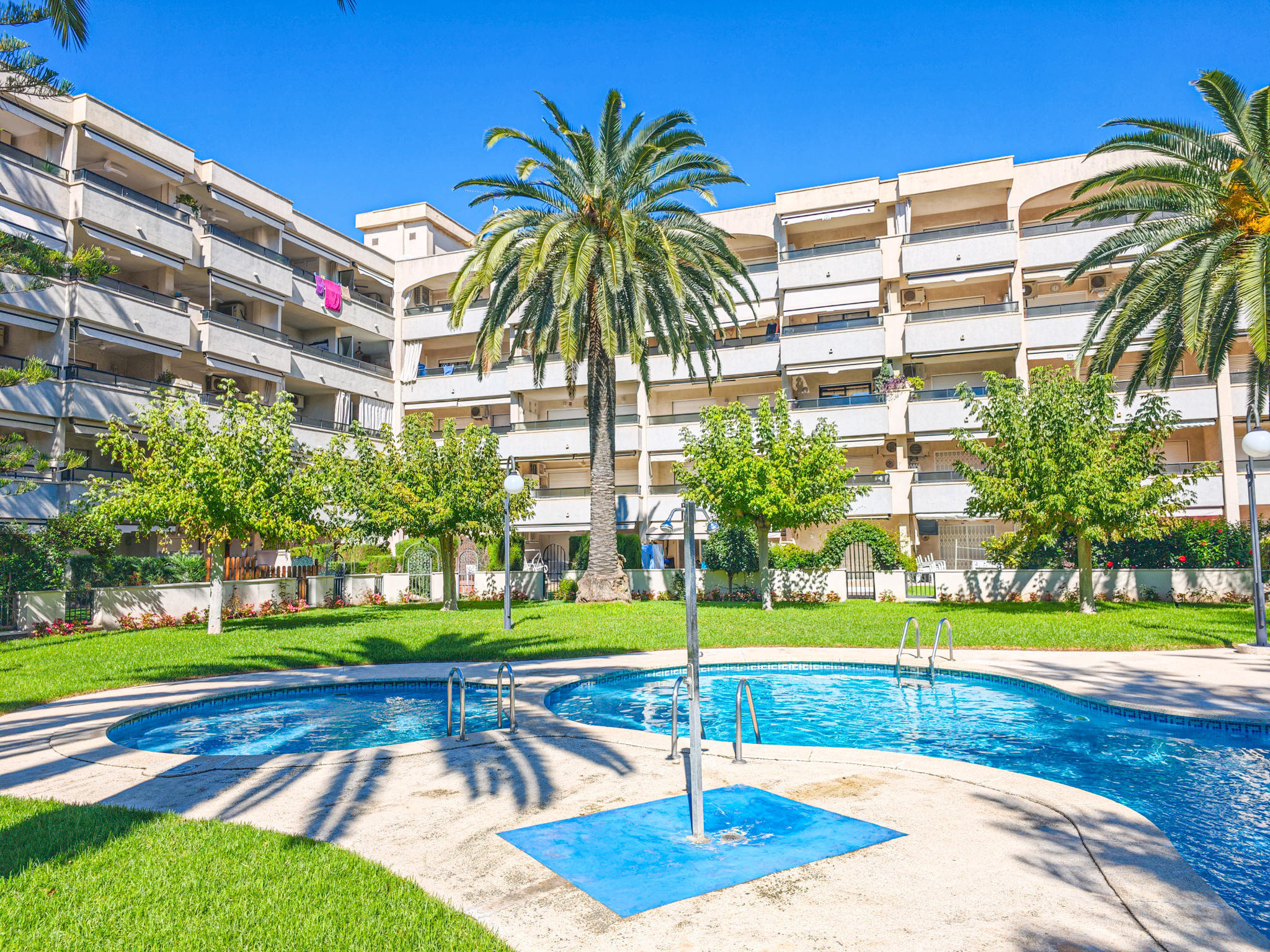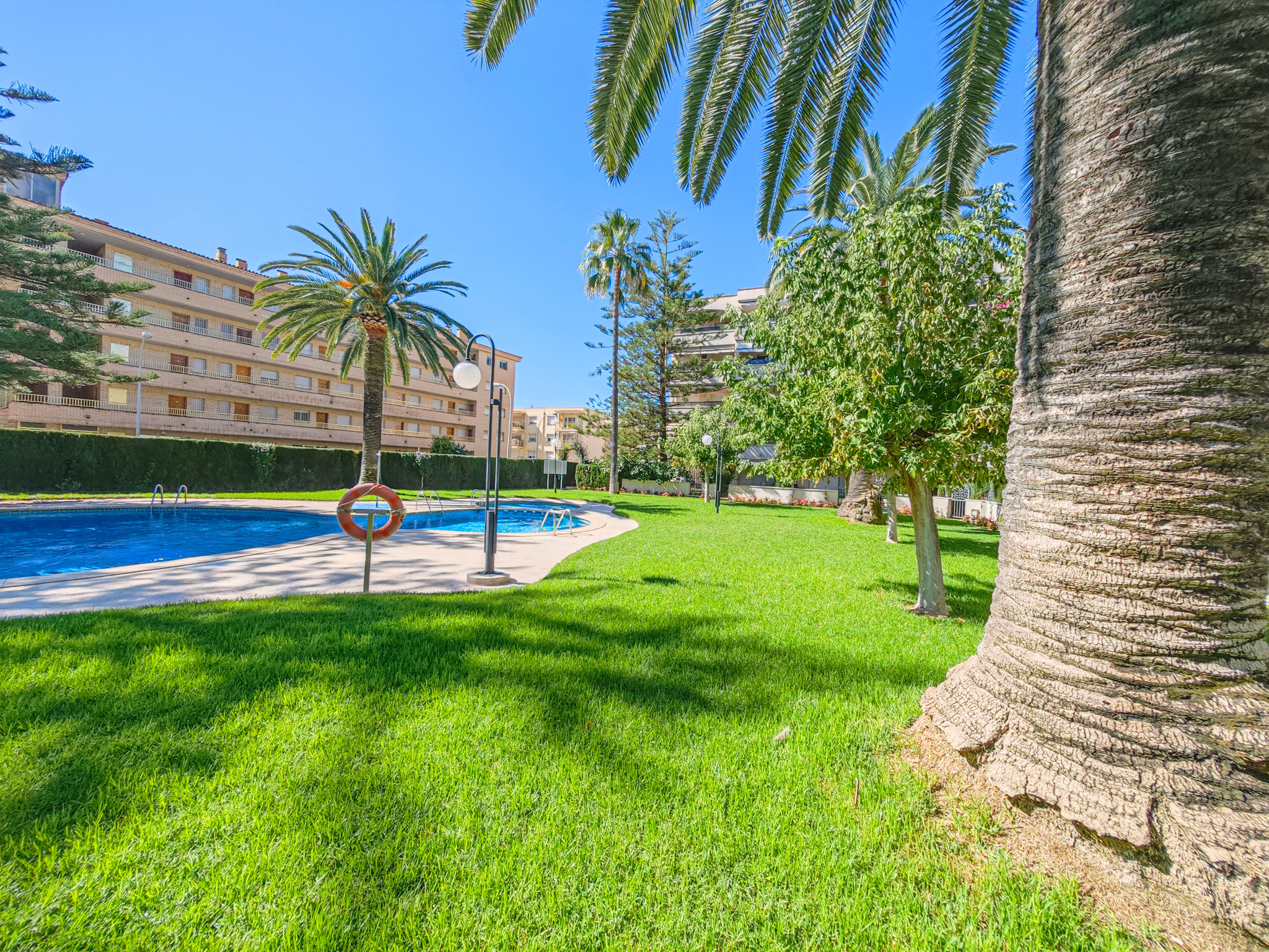 Vue sur la piscine et parc et emplacement à 100m de la plage.