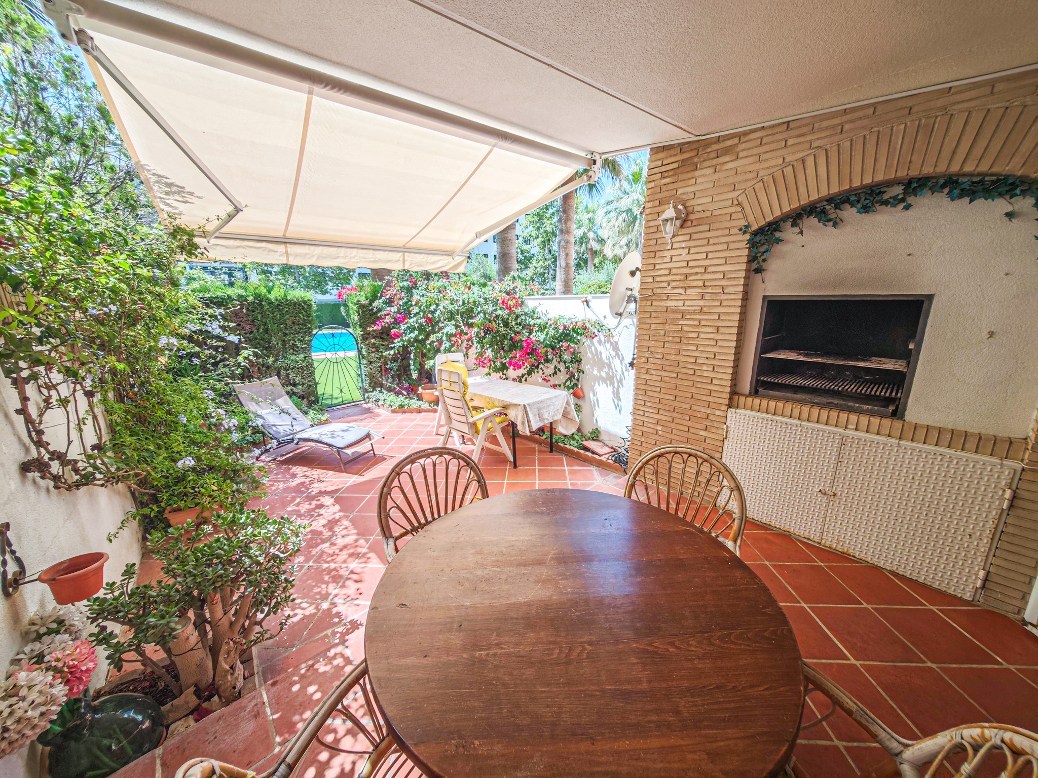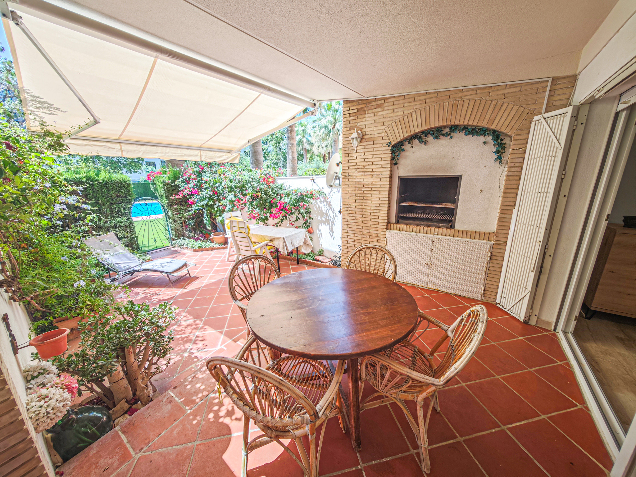 В доме Tramontana есть красивая терраса с барбекю, стульями, столами и навесом. С террасы имеется прямой выход на большую общую территорию с двумя бассейнами для детей и взрослых.