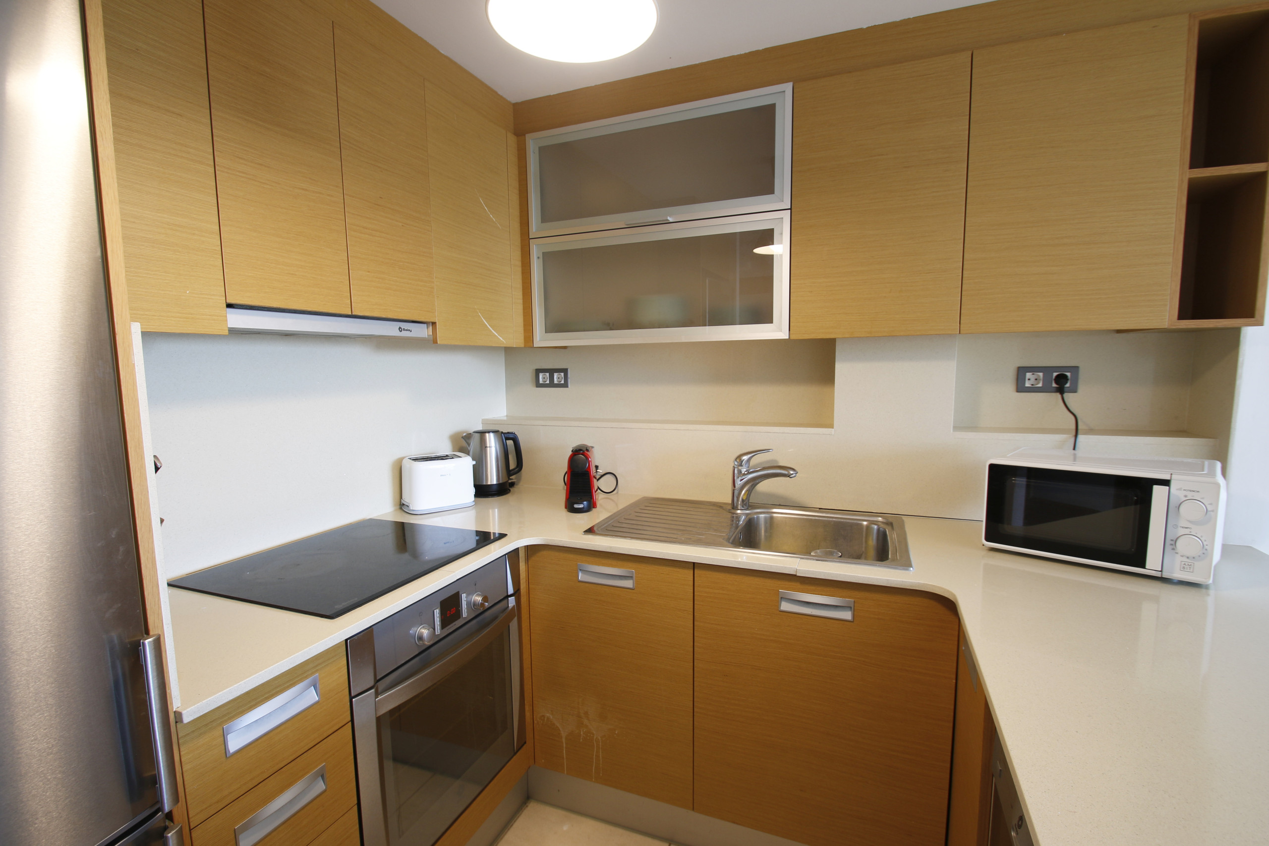 Кухня, совмещенная с залом, оснащена плитой с керамическим покрытием, оборудовано холодильник, микроволновая печь, духовка, морозильная камера, посудомоечная машина, столовые приборы, кухонная утварь, кофеварка и тостер.