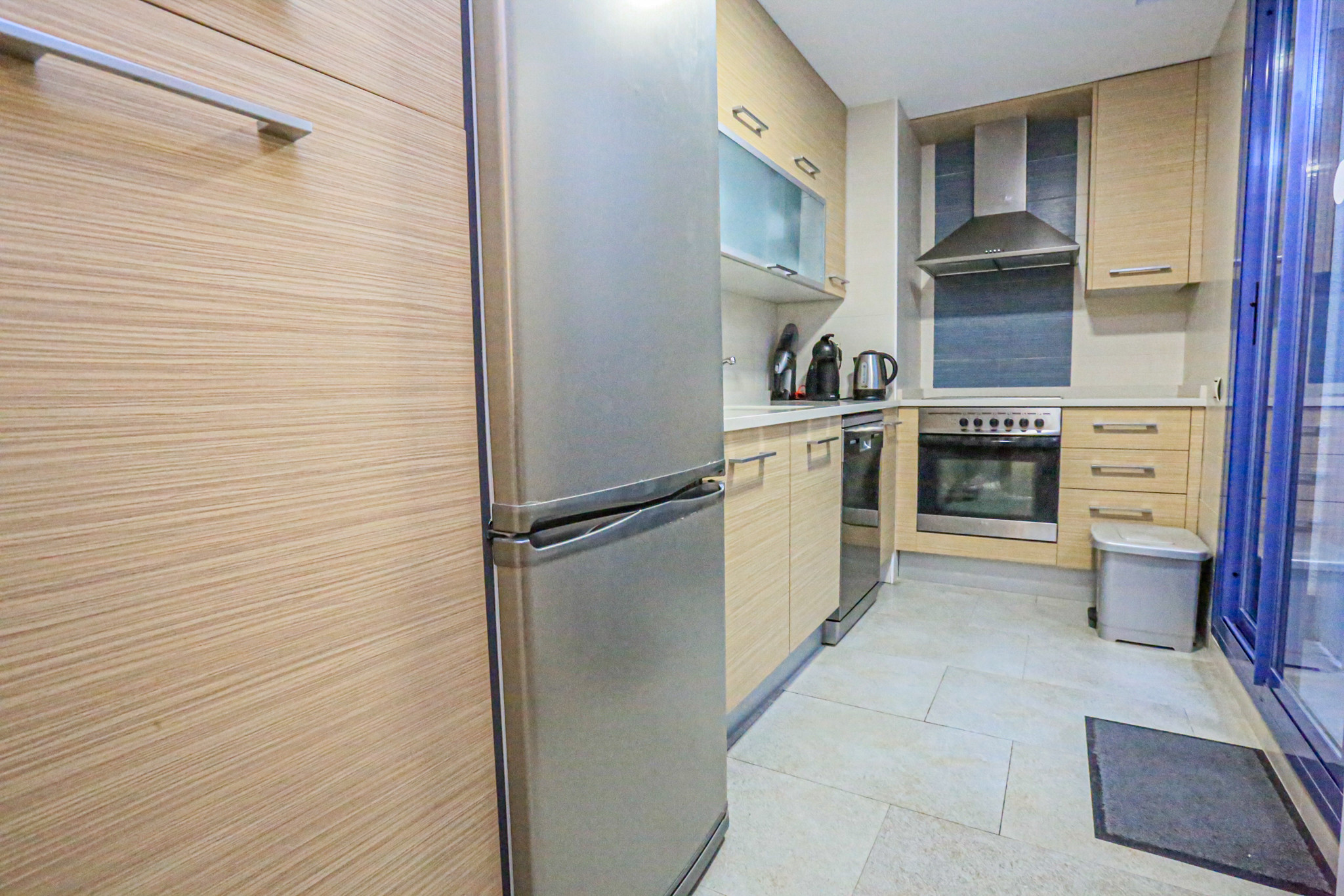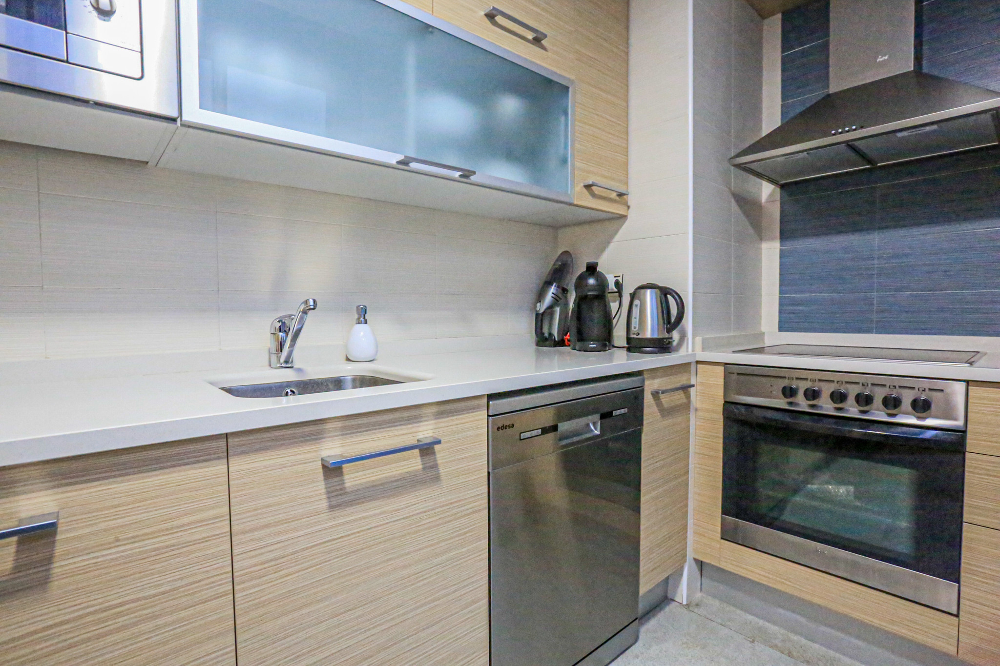 La cuisine est entièrement équipée d'électroménagers de dernière génération, comprenant un réfrigérateur, un congélateur, un lave-linge, un lave-vaisselle, un micro-ondes, un four, une cafetière et un équipement de cuisine complet.